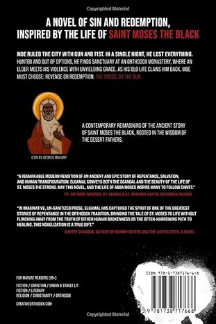 Moses: The Cross and the Gun is a contemporary novel based on the life of Saint Moses the Black. Readers follow a gang leader’s journey toward repentance and struggle with “the old man” and the past. The book is heavily inspired by ancient Christian writings and desert wisdom, with themes from Saint Anthony the Great, Saint Macarius, John Cassian, Evagrius, Saint Theophan the Recluse and more. An honest story of repentance, in unflinching prose.